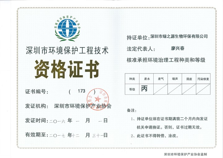 深圳市綠之源生物環(huán)保有限公司成立十余年,是經深圳市環(huán)保局批準的具有專項環(huán)保工程設計資質的企業,深圳市高新技術企業。公司從創(chuàng)立初期的水處理藥劑、水處理設備的研發(fā),逐步成長為環(huán)保類綜合性服務的企業,目前年營業額約三千萬,集水處理藥劑研發(fā),工業廢水、廢氣及農村生活污水處理等環(huán)保工程的設計、安裝、調試、運營、技術咨詢一條龍服務,為珠三角眾多企業服務,解決相關環(huán)保難題,并取得了良好的社會效益和環(huán)境效益。